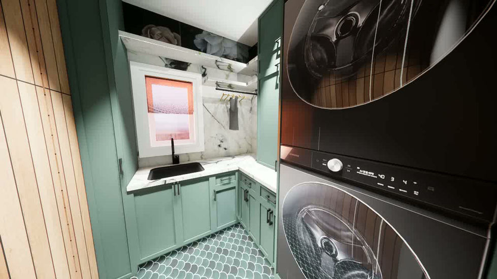 This space features a laundry room, equipped for all laundry-related tasks. Including a high-tech laundry centre. hanging area, folding space, open shelving, and a pull-out broom storage and ironing board.